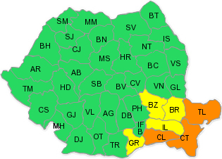 În judeţele Constanţa, Tulcea şi Călăraşi se vor cumula 50...70 l/mp şi izolat peste 80 l/mp, iar vântul va sufla tare, cu precădere în zona litoralului, unde rafalele vor depăşi 70 km/h.